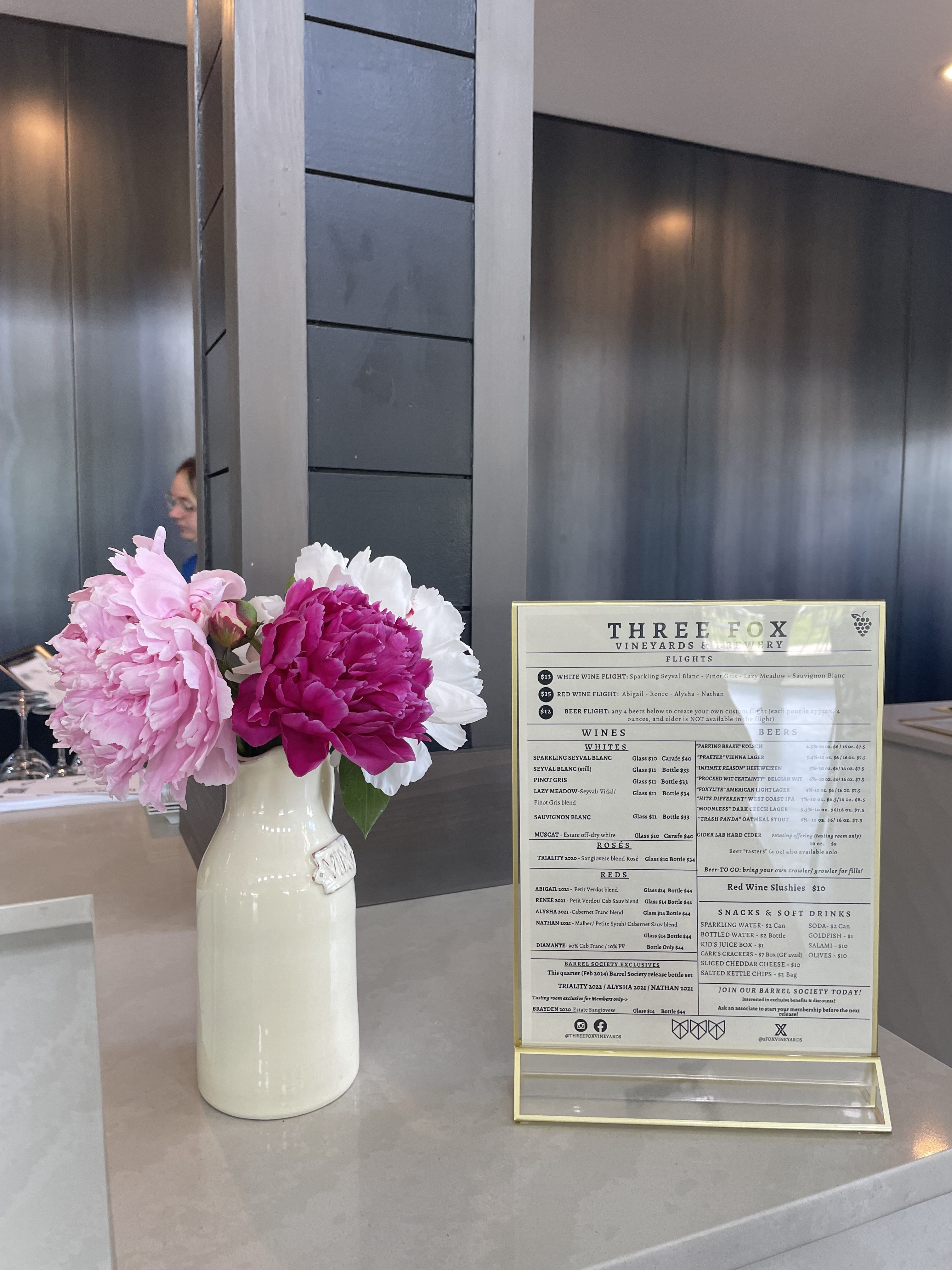 Overall, I was BLOWN away by my visit at Three Fox Vineyards & Brewery! The staff that I met, including Christina, Robin, and Molina (not sure if it’s spelled correctly!), were all EXTREMELY kind and hospitable. One of the things that stuck out to me about Three Fox’s interior design was the unique touch of bouquets across the tables. I later found out that those gorgeous bouquets were mostly the product of the staff’s *very own* gardens at their respective homes. HOW LOVELY!