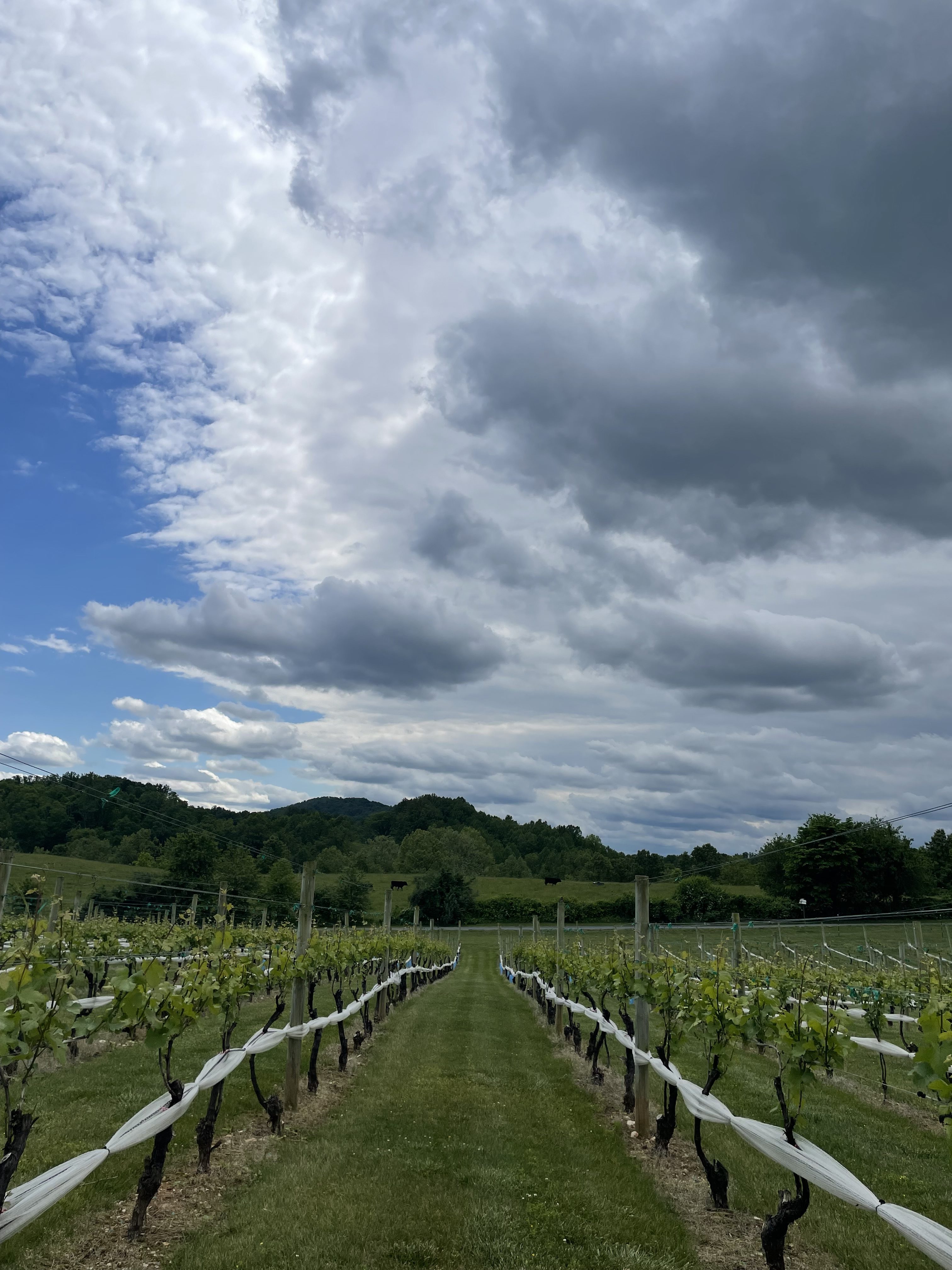 Now, I was seated at an amazing location onsite … a table in the grape vines!!!! YES, the grape vines!!! HOW NEAT! Three Fox ALSO has a local third party pizza vendor onsite which I grabbed some lunch at alongside my complimentary white wine tasting. While seated in *none other than the grape vines* I enjoyed taking in ALL of the incredible vibes here at Three Fox Vineyards & Brewery, including a front seat row to watching … the cows come home (no LITERALLY!). I had never sat in a table in the grape vines and I truly felt like royalty thanks to the staff at Three Fox!