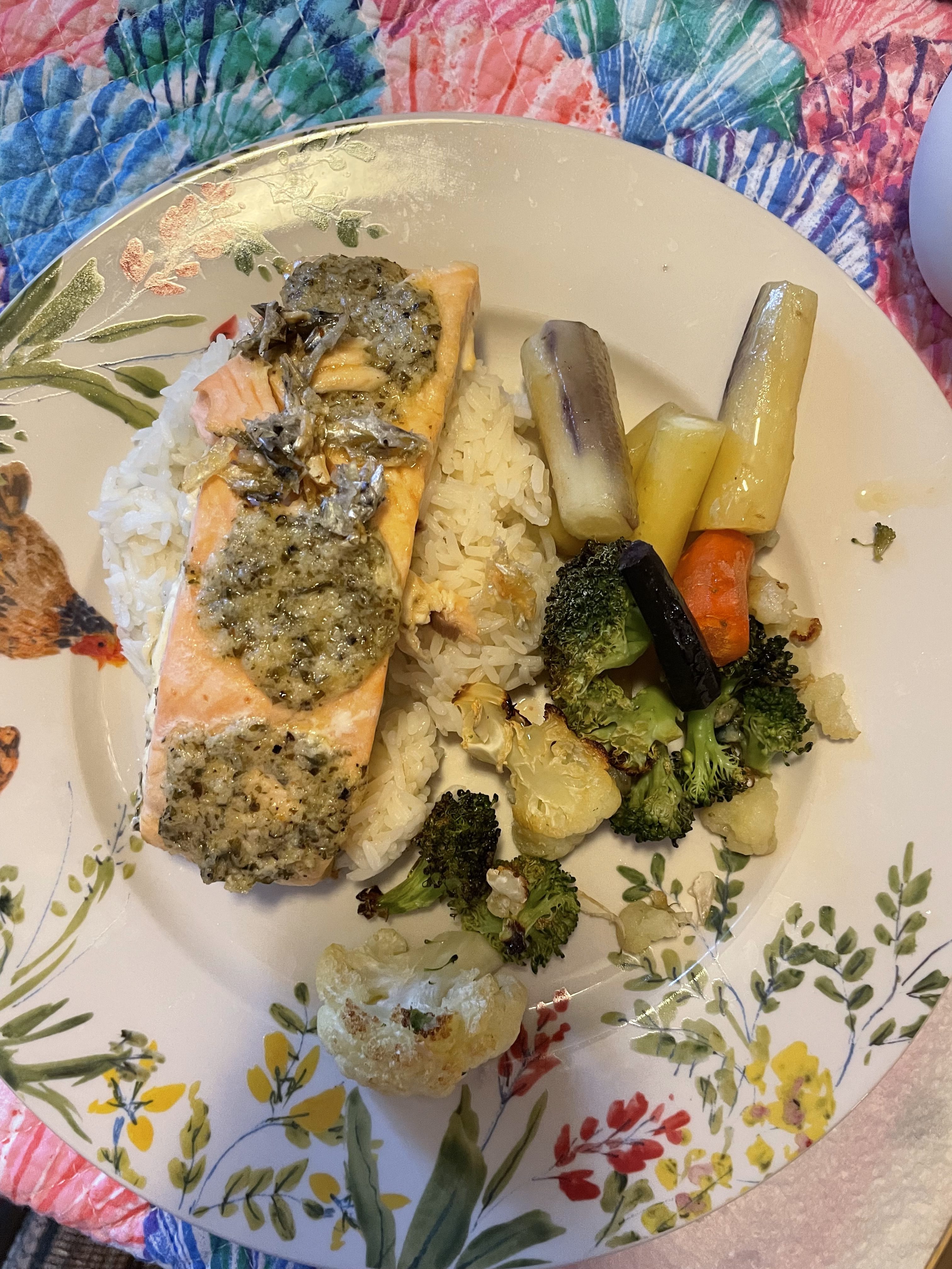 Honey Mustard-Marinated Salmon with Mashed Potatoes and Roasted Broccoli