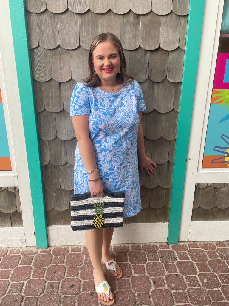 My FAVORITE part of kicking off NWYLD is the sheer fact that I can *finally* use the #SummerInLilly acceptably – LOL!! Every day feels like summer when you’re in Lilly Pulitzer, though (!!!). I decided to *finally* pop the tags on my Cody Shift dress from the Sunshine Sale back in September 2022, which I write about here, and pair it with my Talbots straw navy and white striped pineapple clutch which I got from ThredUp, Jack Rogers pineapple and flamingo sandals, and jewelry from the likes of Kendra Scott, Amazon, Target, and The Inspiration Co. This outfit was PERFECT for shopping on the Bethany Beach boardwalk and dinner nearby afterwards. It was also the best look to commemorate #SummerInLilly!