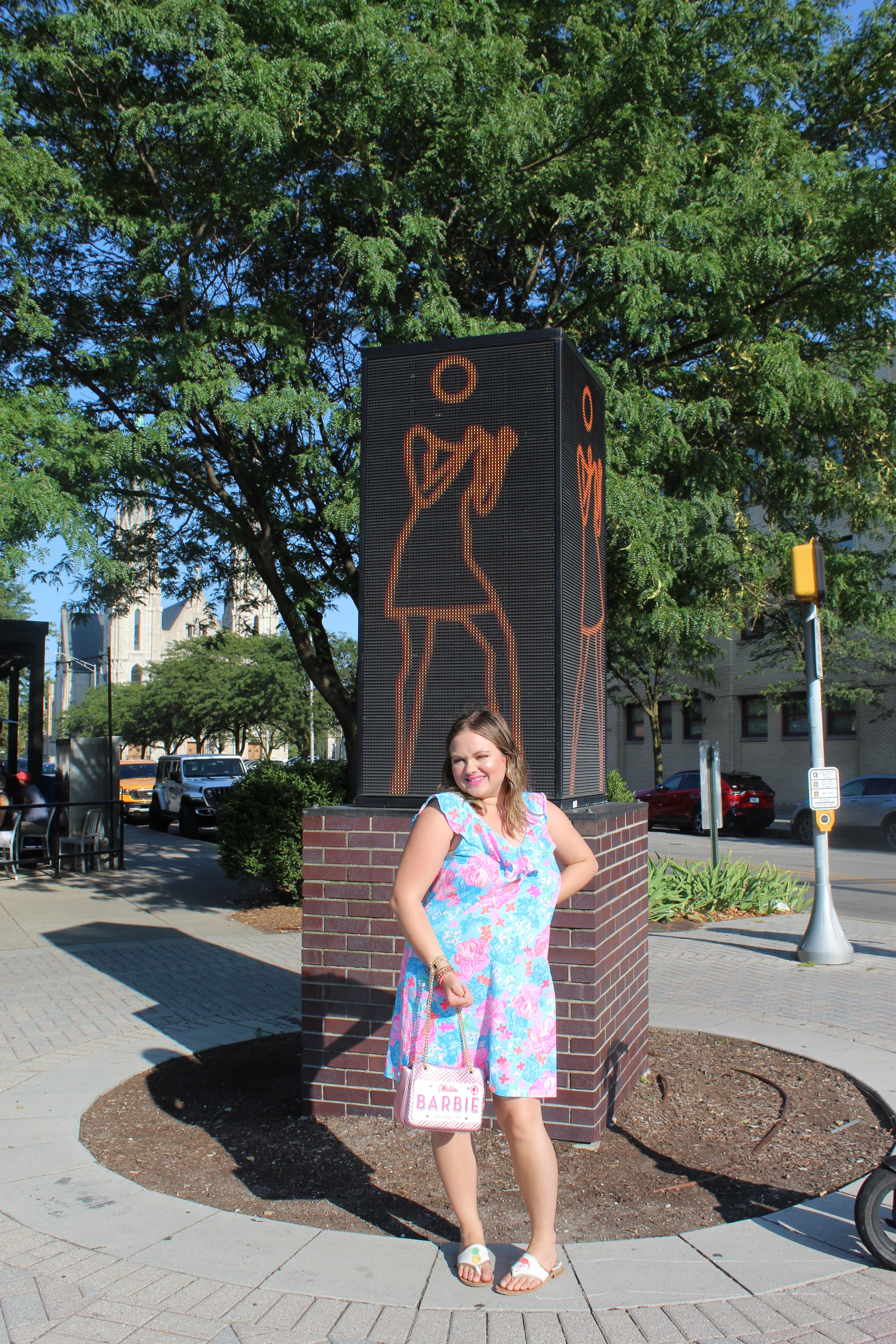 Sightseeing and Shopping at Mass Ave – After a nice stroll and climbing the Soldiers and Sailors Monument at Monument Circle, Lindsay and I headed to Mass Ave. Massachusetts Avenue (regularly known as Mass Ave) is known for gorgeous architecture, shops, hotels, and restaurants. We ended up parking by the old Coca Cola Factory and strolled by and through the gorgeous lobby of the adjacent Bottleworks Hotel. We walked up Mass Avenue and saw plenty of gorgeous architecture which I *of course* snapped several photos of (!!!!) and stopped by the adorable Francis + Fern boutique which sells several adorable Taylor Swift-themed merchandise as well as adorable clothing! We also danced a bit with the iconic dancing lady on her automated screen that I got to meet for the first time in 2023. Mass Ave is definitely a charming and beautiful part of Indianapolis!